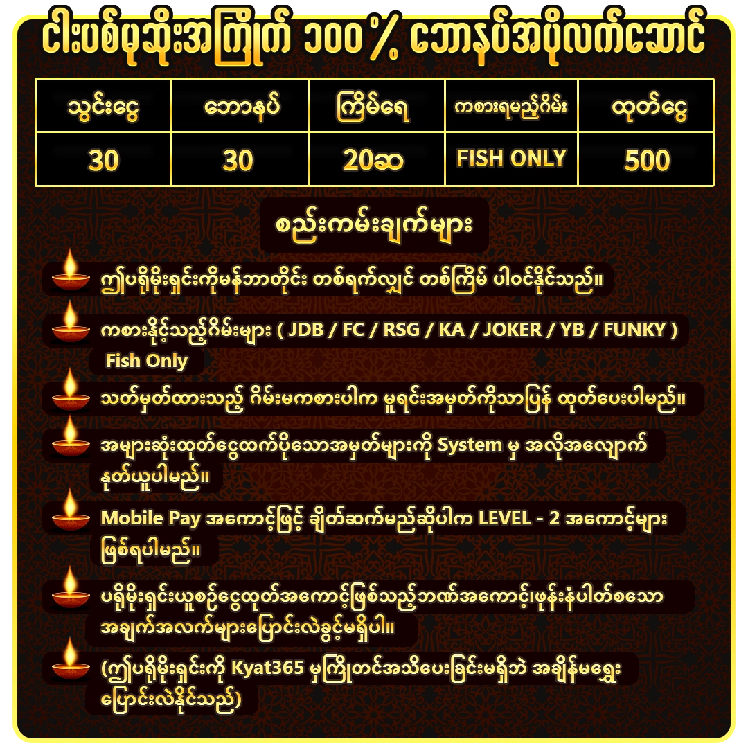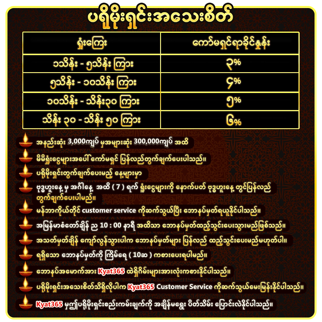 4.Kyat365 မွဤပ႐ိုမိုးရွင္းစည္းကမ္းခ်က္ကို အခ်ိန္မေ႐ြးပိတ္သိမ္း ေျပာင္းလဲႏိုင္ပါသည္။