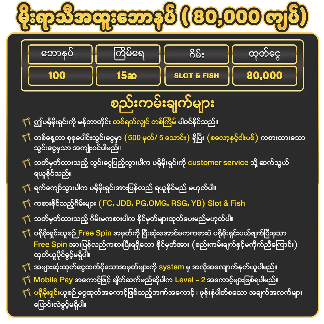 1.7.2025 မွစတင္အေကာင့္ဖြင့္သူတိုင္းကို ဖရီးလက္ေဆာင္ခံစားခြင့္ရွိသည္။